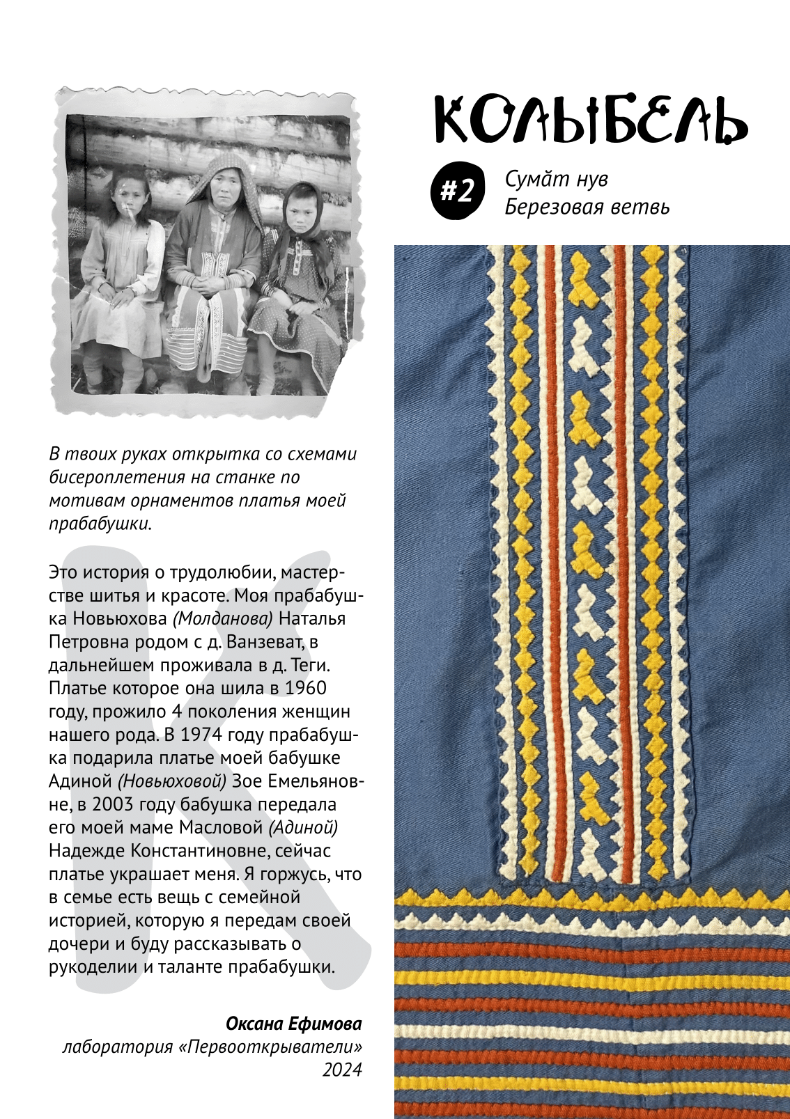 Исследование Оксаны Ефимовой отталкивается от реликвии ее семьи — платья прабабушки. Оксана погружается в историю своего рода и узнает, что ее прабабушка занималась рукоделием. Проект актуализирует народные художественные практики, связанные с шитьем и плетением